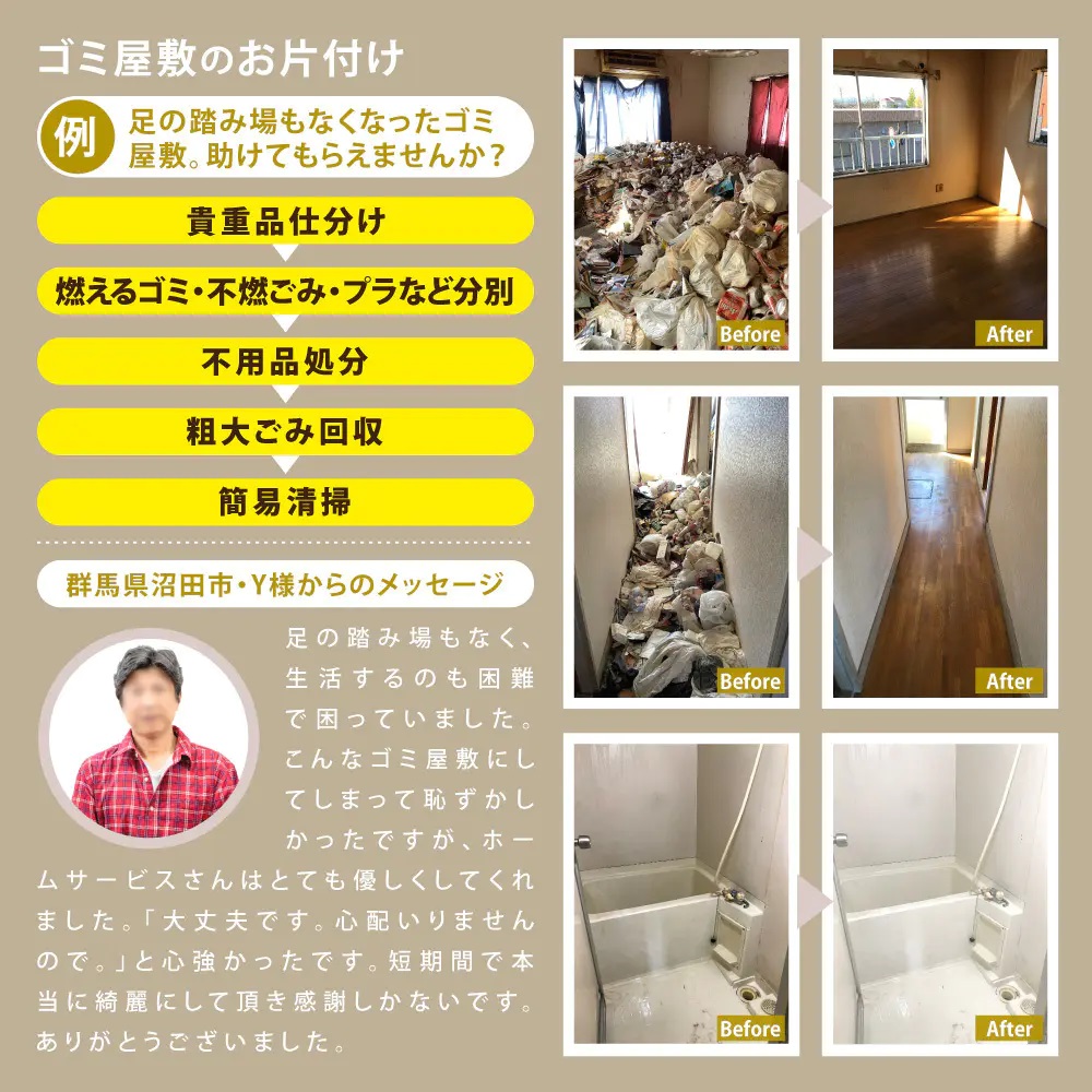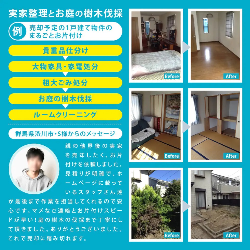 あかぎホームサービスでは、お家の中だけ片付ける実家の片付けだけではなく、ゴミ屋敷化させてしまったお家の片付けや、お庭・ビニールハウスの撤去まで、実家まわりの片付けならどんな片付けもお引き受け可能です。