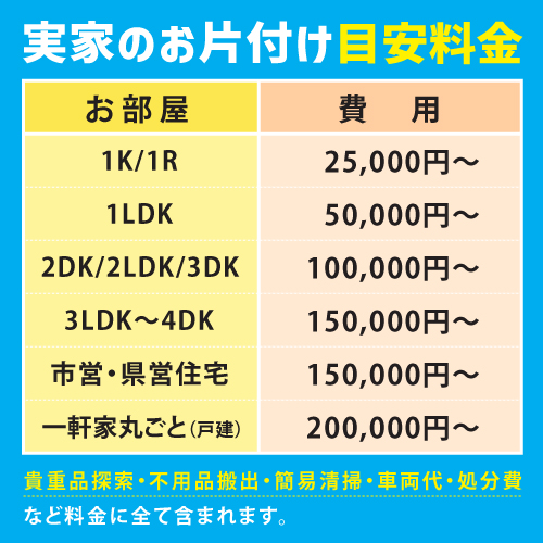 当社の料金は、貴重品の仕分け、不用品搬出、簡易清掃、車両代、処分費などの作業と物量に対しての料金です。