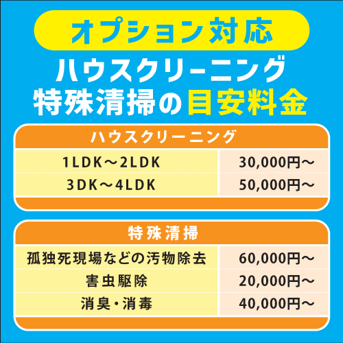 オプションとはなりますが、お片付け後のハウスクリーニングや特殊清掃も可能です。